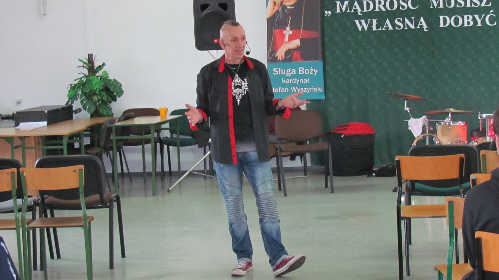 Muzyk przybliżył uczniom problem przemocy i agresji wśród młodzieży, cyberprzemocy, uzależnienia od alkoholu, papierosów, narkotyków i dopalaczy. Przeciwstawił się również wulgaryzmom w języku młodego człowieka. Problem dopalaczy został szczególnie wyeksponowany przez artystę, który mówił, że jest to bardzo niebezpieczna i często zakamuflowana forma uzależnienia. Jako alternatywę proponuje młodzieży zaangażowanie się w różnego rodzaju grupy wolontariatu pokazując, ze jest tam miejsce na godny i radosny rozwój.